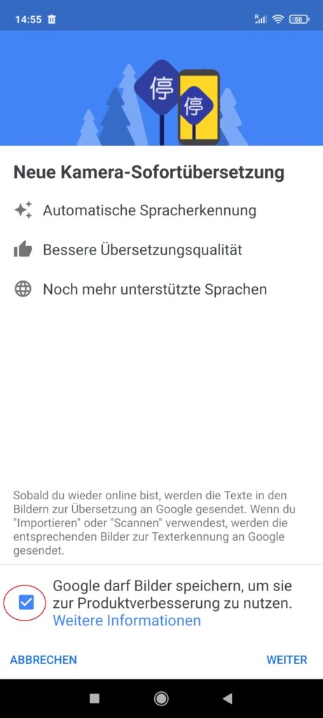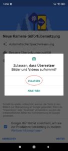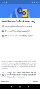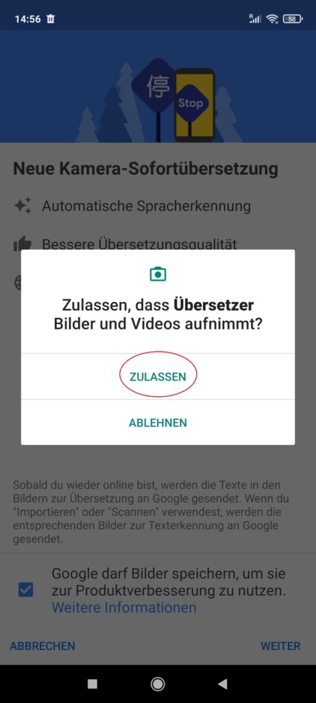 Öffnen Sie die App und ermöglichen Sie Google in den ersten zwei Schritten die Bilder zur Produktverbesserung zu speichern und auf Ihre Fotos und Videos zuzugreifen, damit Sie die Kamera Übersetzung benutzen können.