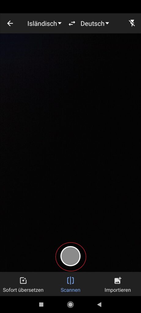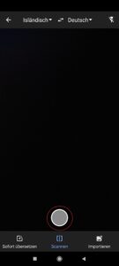 Diese Funktion ermöglicht Ihnen, einzelne Worte oder ganze Sätze zu übersetzen und gibt somit etwas genauere Übersetzungen. Halten Sie Ihre Kamera über den gewünschten Text und starten Sie das Scannen, indem Sie auf den Kreis Tippen.