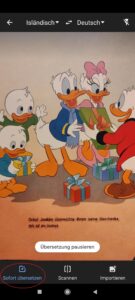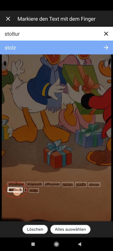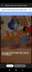 Die erkannten Worte können Sie entweder mit Ihrem Finger markieren, um die Übersetzung zu sehen, oder Sie können auch alles auswählen. Wenn Sie alles auswählen, tippen Sie auf den Pfeil neben dem Text und Sie werden auf die Startseite weitergeleitet, wo Sie den ganzen Ausgangstext und die Übersetzung im veränderbaren Format zu sehen bekommen. Diese Funktion ist nur verfügbar, wenn Sie online sind.